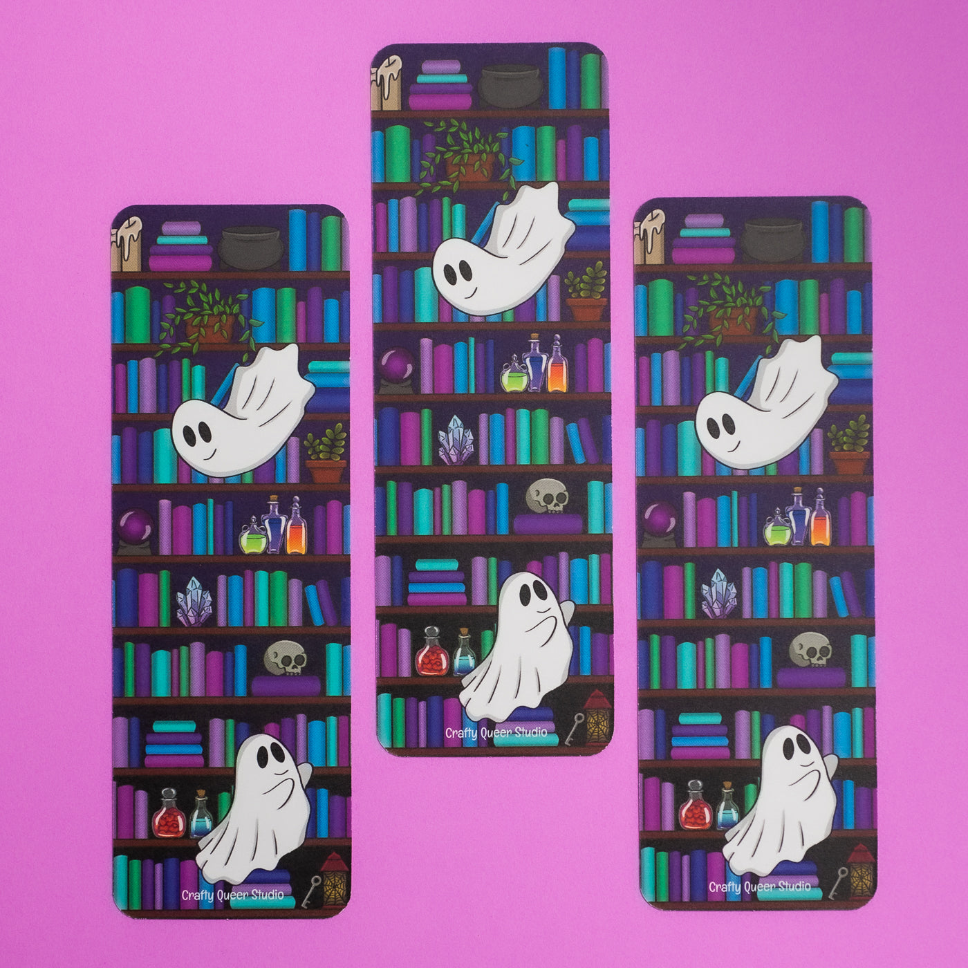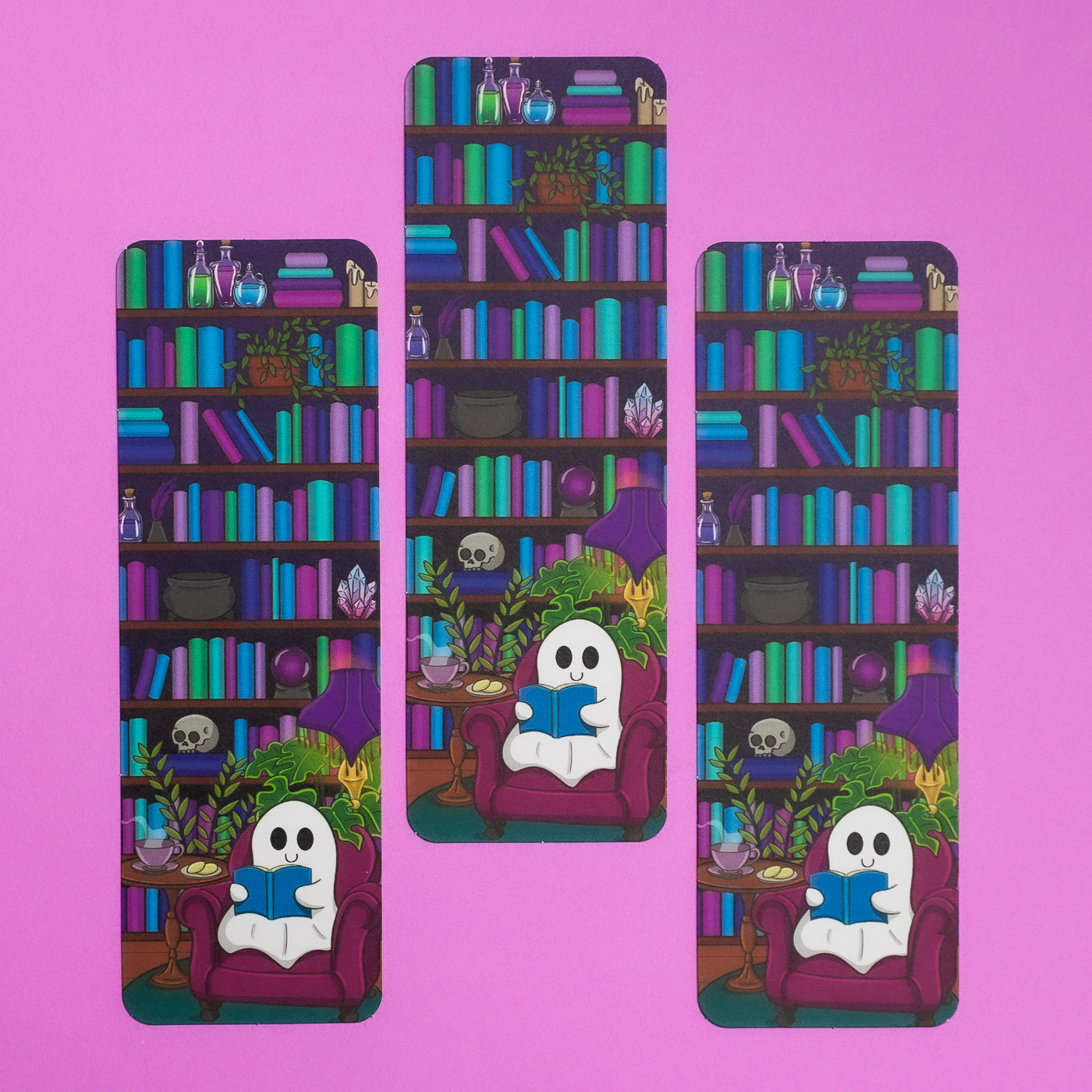 This cute bookmark features some lil' ghosties reading in their frankly beautiful library - because great stories transcend the living world. Bring the cozy vibes and never lose your place knowing that somewhere, a ghost is curled up with their favorite book, judging your TBR pile.